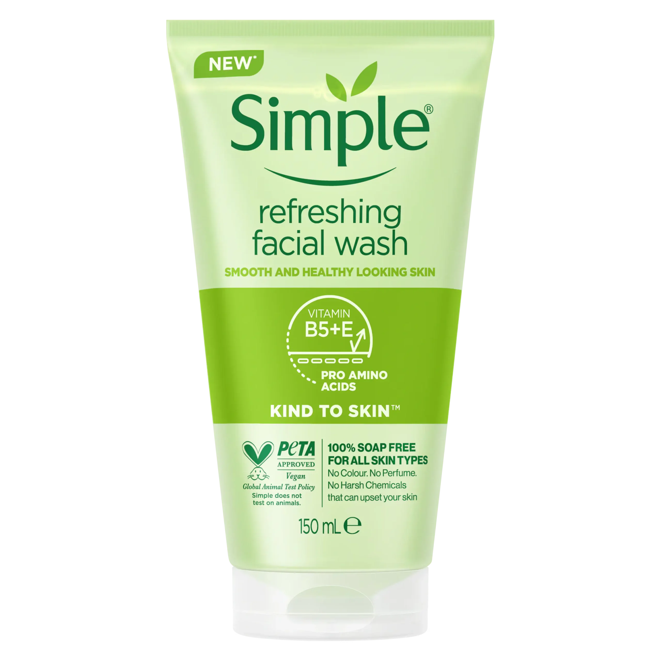 ژل شستشوی مرطوب‌کننده و ملایم صورت سیمپل – حجم ۱۵۰ میلی‌لیتر، شوینده‌ای ملایم برای پوست حساس که آلودگی‌ها را پاک کرده و پوست را نرم، مرطوب و شاداب نگه می‌دارد.
